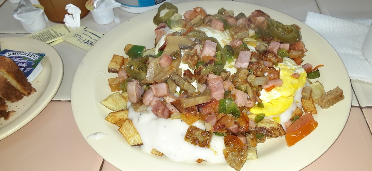 It normally is perfect this time was almost an hour later on getting our food which like they say it is a fine in place and not a fast food place so that is expected on a busy day as well lol but after we got the food there was no complaints. I always forget to take a picture before I start eating but I can show what's left of what I ordered though and will be ordering again don't remember the name of it but open the menu & on the middle page it's like the 2nd or 3rd one after the 3 waffles dish. You can't tell by looking at my to go plate but its loaded with diced up home fries platter with eggs,cheese,sausage,tomatoes,onion's, and gravy smothered all over it comes with mushrooms, jalapenos and something else but I didn't get it loaded and comes with a biscuit and jelly or toast which ever bread or meat choice you prefer